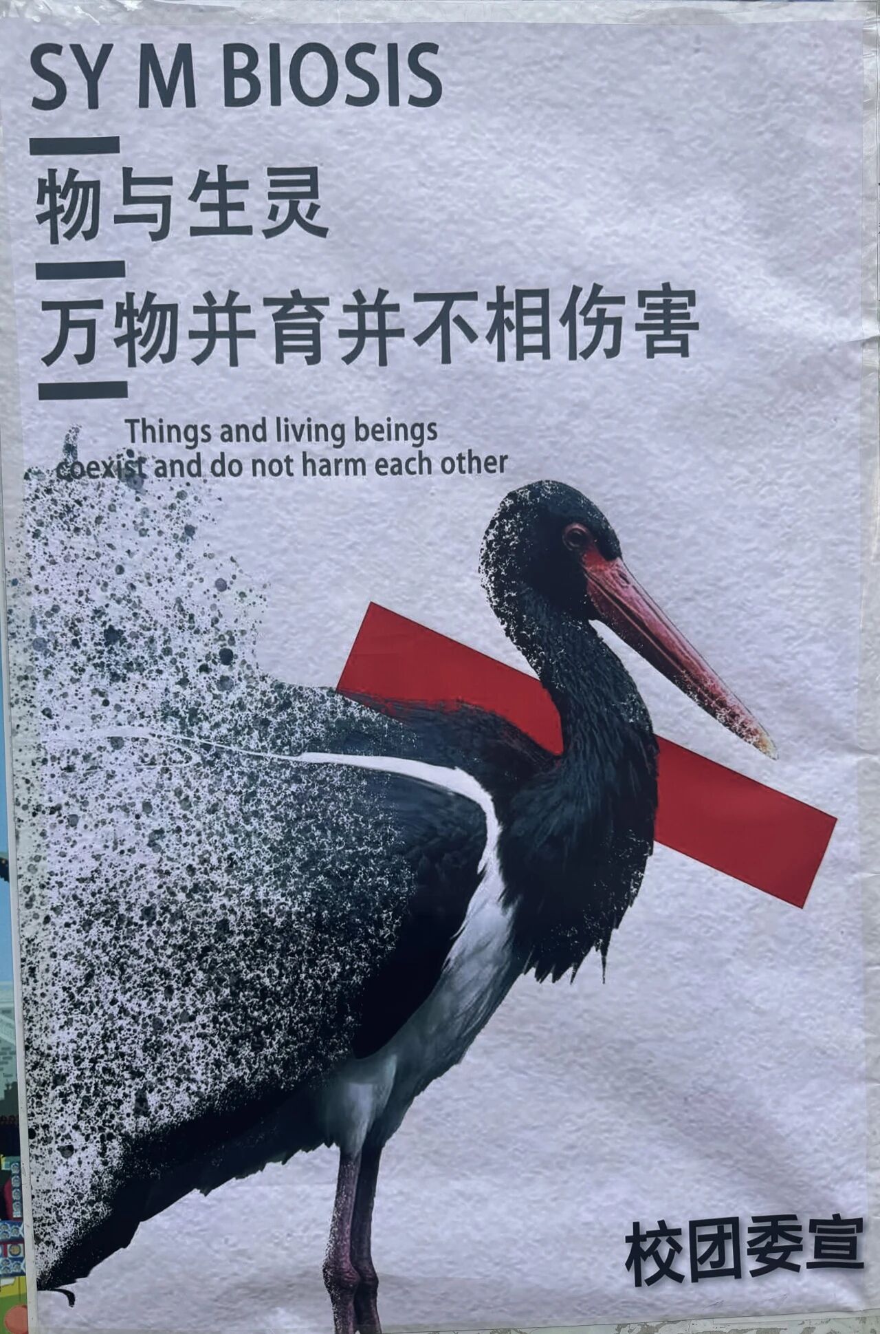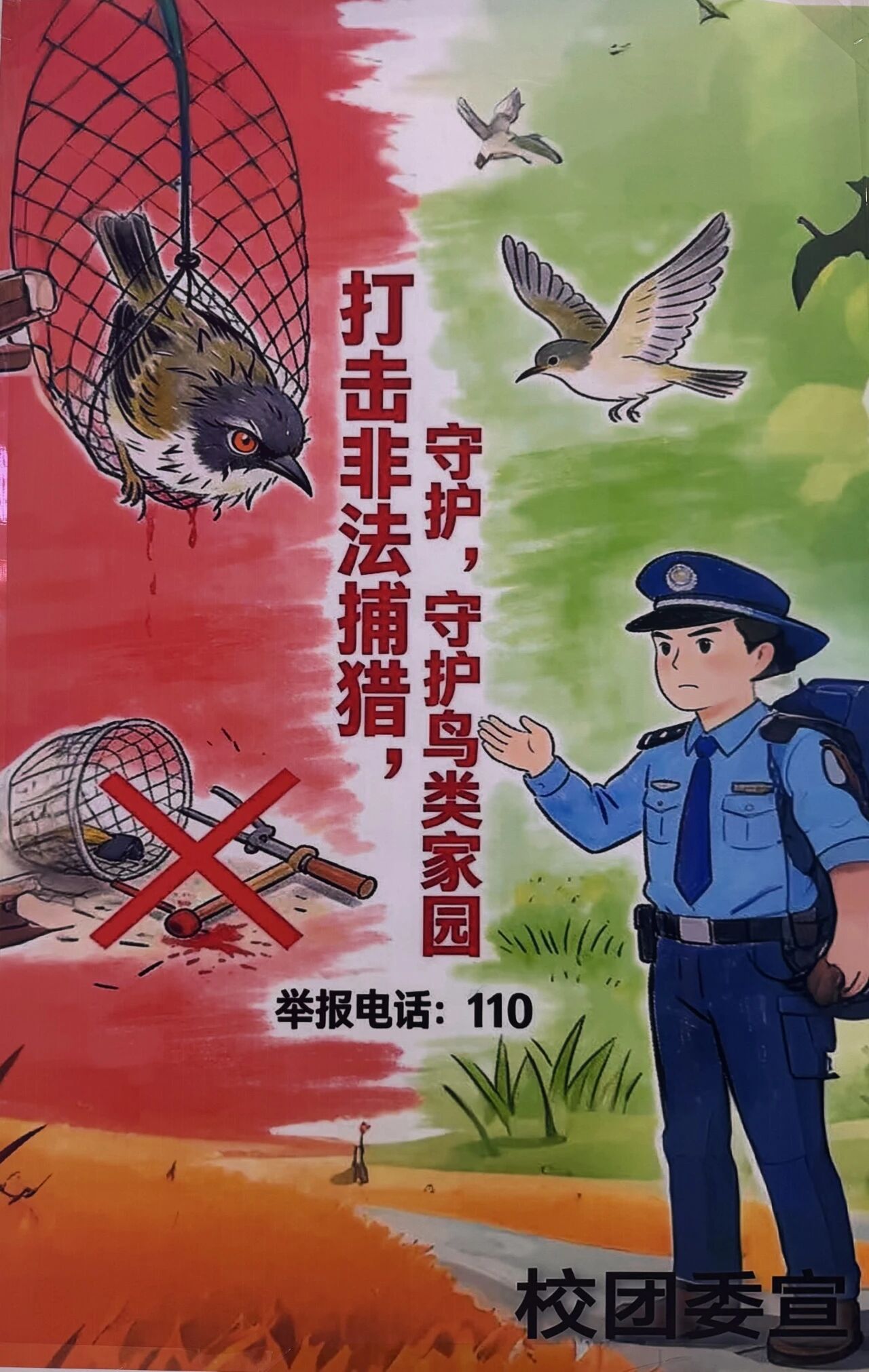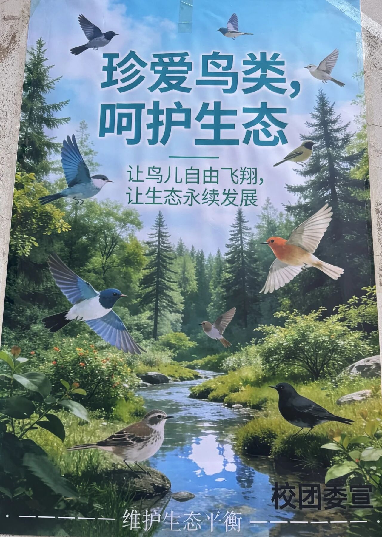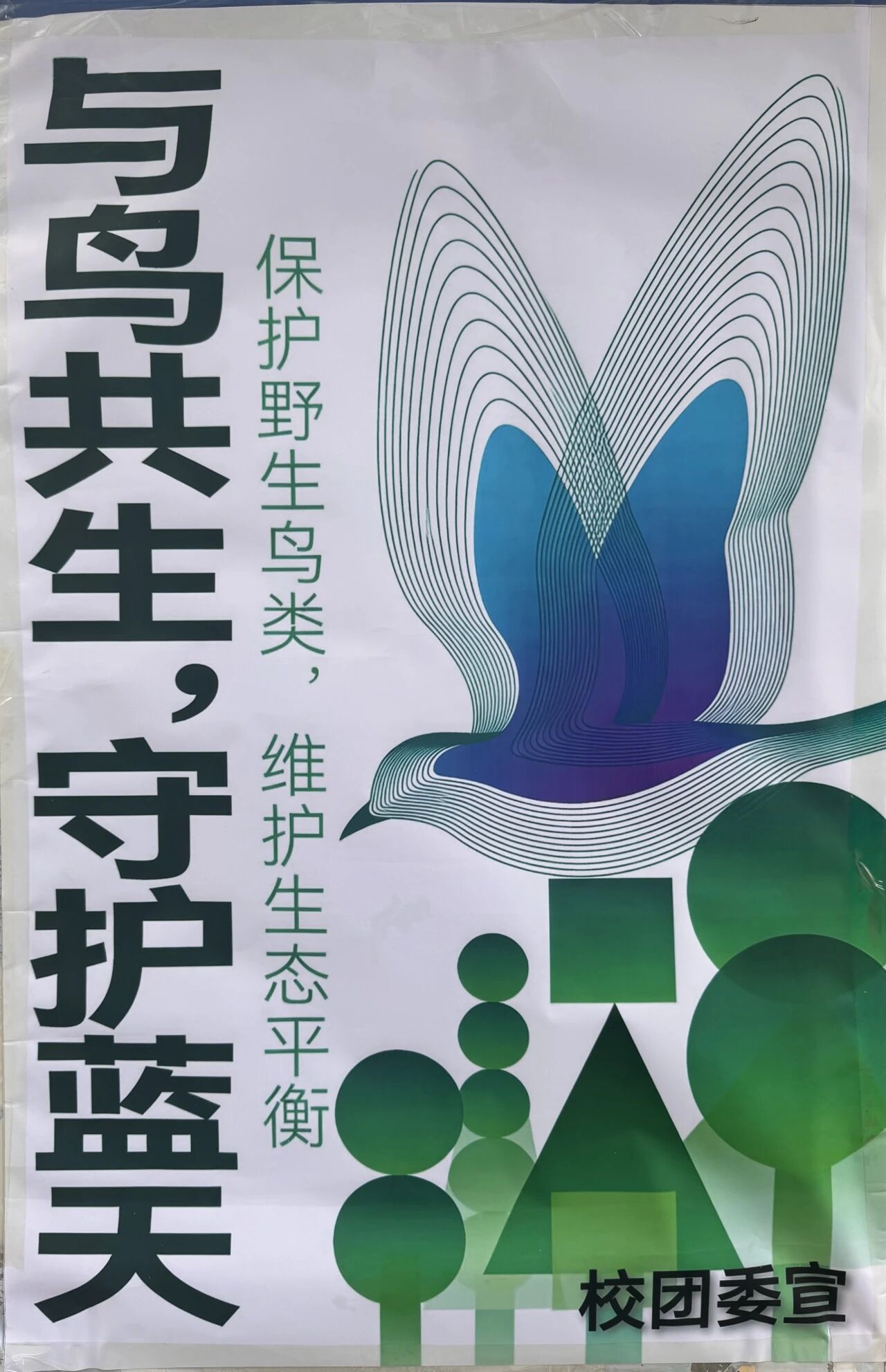 作为前期创作展播活动的延伸实践,校团委充分发挥艺术宣传优势,精准选址教学楼、图书馆、食堂、宿舍楼等师生高频活动区域,张贴经过专业评审筛选的优秀海报作品。这些作品以丰富色彩与生动笔触,生动诠释“拒绝非法猎捕”“守护候鸟家园”等核心理念;同时在校园主干道的醒目位置,悬挂“展翼护鸟,让自由永驻天空”主题条幅,让艺术之美与护鸟理念相得益彰,构建沉浸式宣传氛围。